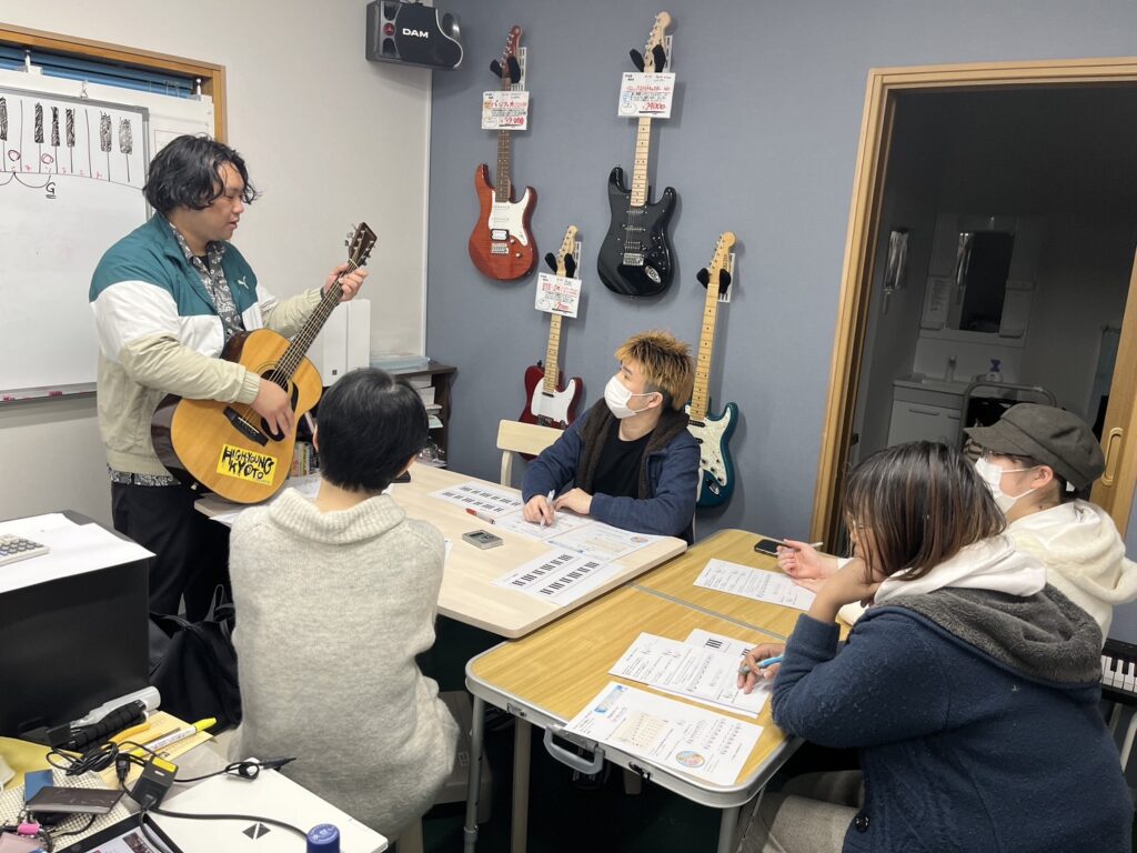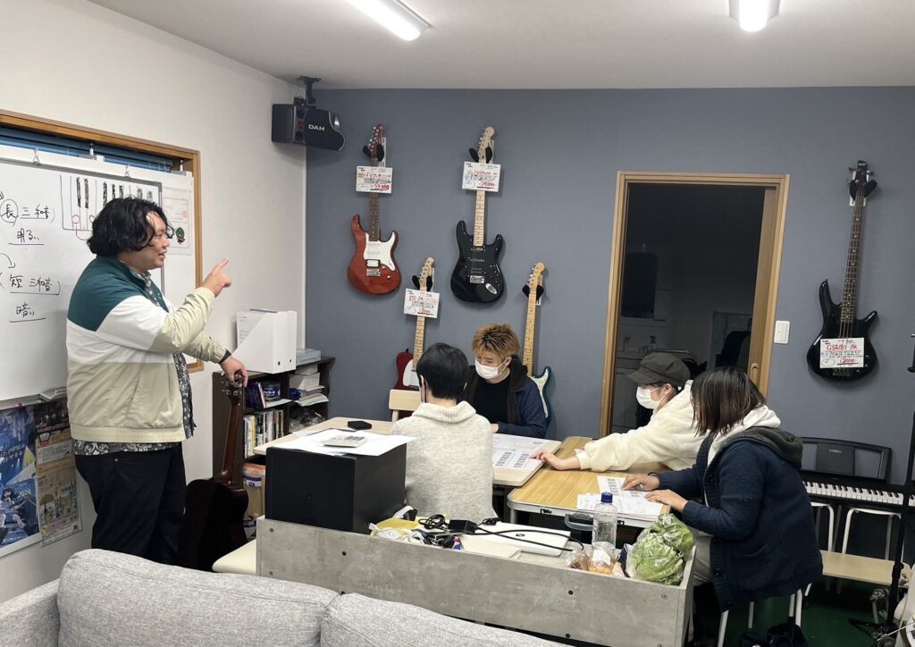 スタジオで練習もできるし、音楽教室ではギターやベース、ドラムなど軽音楽の楽器を、初心者向けに私が直接レッスンしています。